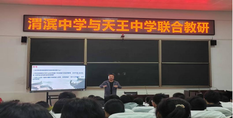 本次教育见习活动以渭滨中学与天王中学联合教研的形式展开。天王中学齐蓉蓉老师通过《登高》教学示范,以创新性的教学方法,展现了跨学科教学对学生思维迁移、综合能力培养的智慧。她采用一个围绕杜甫展开的接龙造句互动游戏导入课堂,充分调动起了学生的学习兴趣,接着引导学生朗读诗歌划分节奏,明确本诗的感情基调,同时教给学生用“作注”的方式深入学习诗歌。在引导学生品读诗句的过程中,能够自然的融入英文翻译帮助学生更深入的理解意象的内涵,结合大自然中的落叶帮助学生直观地体会作者的情感,通过层层递进的高频互动,引导学生深入体悟杜甫诗歌“沉郁顿挫”的风格。