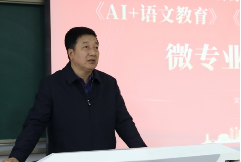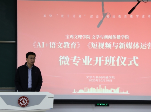 10月29日下午,文学与新闻传播学院在高新校区博文楼副楼105室隆重举行“AI+语文教育”与“短视频与新媒体运营”微专业开班仪式暨开课第一课主题报告会。副校长冯飞龙出席并讲话。活动由副院长孙立主持。