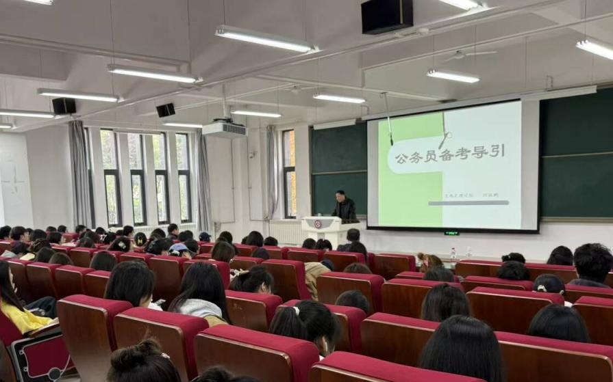 何振鹏以《公务员备考导引》为题,从报考当前面临形势和挑战、岗位选择、考试内容、备考基本方略等四个方面展开详细讲解。他凭借深厚的专业知识和丰富的经验,结合历年考情,为同学们分析了各类题型的特点与解题技巧,还分享了一些实用的备考方法与时间规划策略,让同学们对考公考编有了更清晰、更系统的认识。
