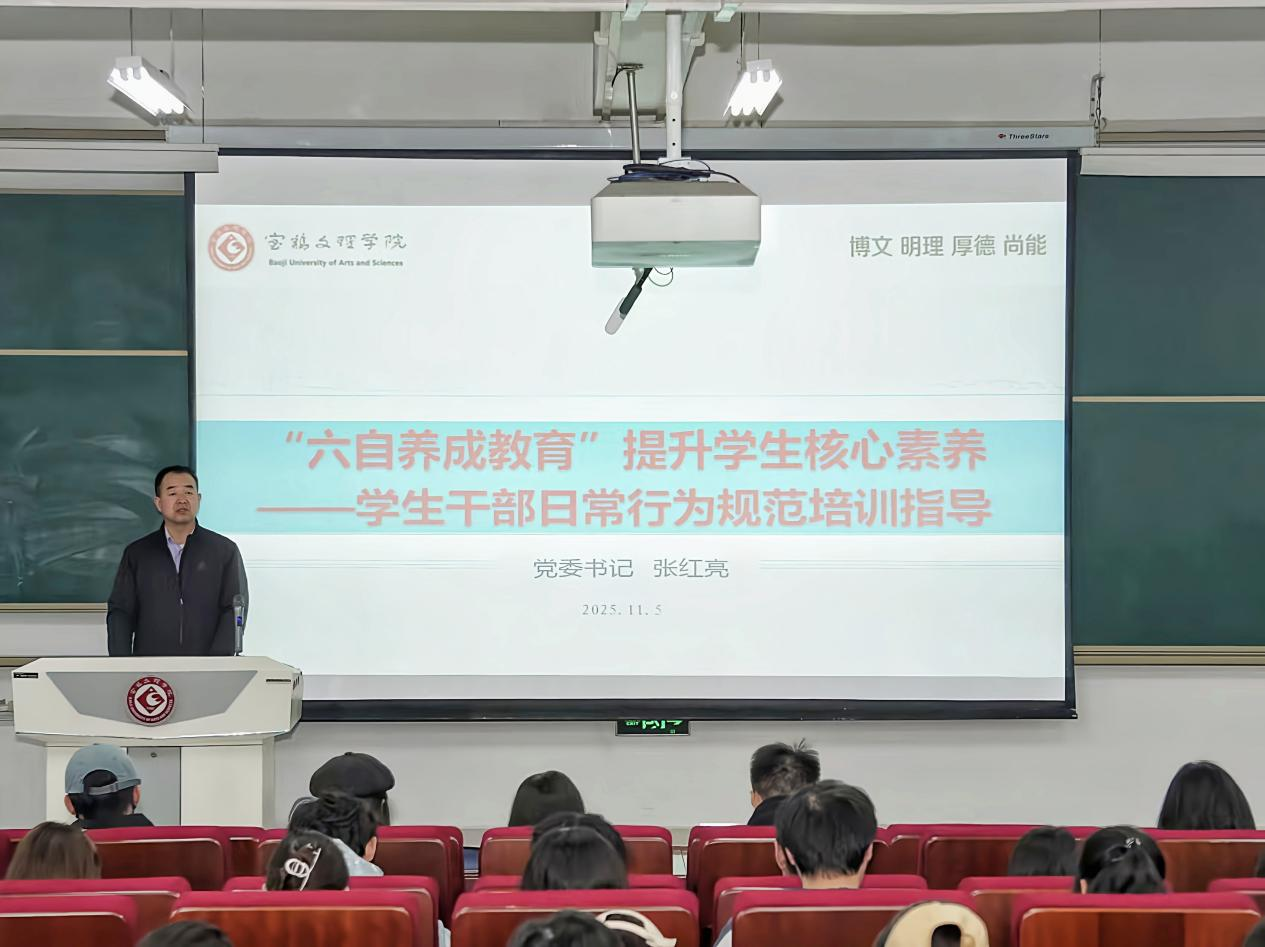 随后,学院党委书记张红亮以“‘六自养成’教育提升学生核心素养——学生干部日常行为规范培训指导”为题作本期培训班第一讲。他以学校发展历史为引入,从养成教育的概念、开展养成教育的必要性、养成教育的途径等方面教育引导学生干部强化自身心理道德素质、提升自身学习能力、明确做人做事准则。他希望大家坚定理想信念,做精神建设的“传播者”;争做学习楷模,做学风建设的“领航者”;关注能力成长,做班级管理的“执行者”;密切联系同学,做集体建设的“服务者”,展现文传学子昂扬向上的精神风貌,持续推动学院学生工作发展再上新台阶。