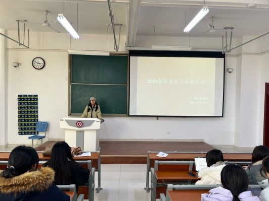 为总结实习成果、分享实践经验,12月3日,我院广播电视编导专业在博文楼508教室举行2026届毕业实习总结大会。学院副院长孙立,教研室杨乐、李鹏鲛及王兰老师,编导专业2022级、2023级全体学生参加会议。会议由实习带队教师贺静娜主持。