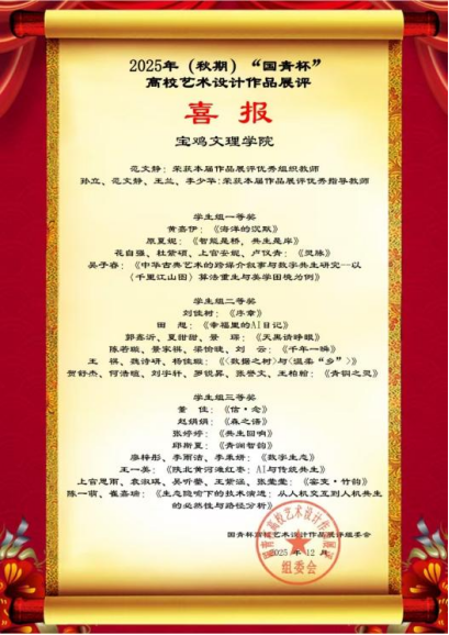 近日,2025年“国青杯”全国高校艺术设计作品评奖活动结束。我院师生获一等奖4项、二等奖6项,三等奖8项。范文静老师荣获“优秀组织教师”称号,孙立、范文静、王兰、李少华老师获评“优秀指导教师”。