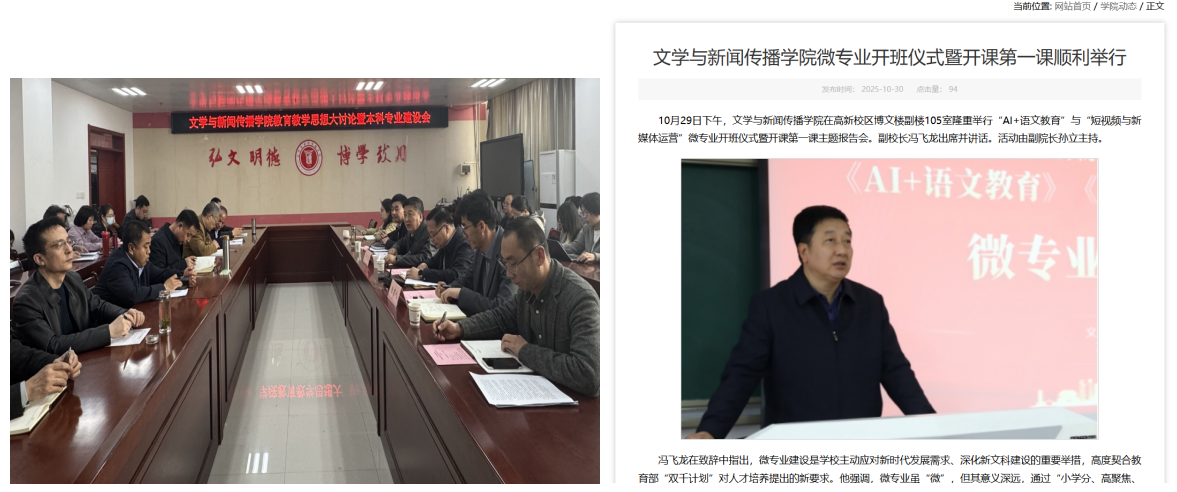 2025年,学院以新文科建设为引领,系统推进专业结构优化与人才培养模式创新。以本科教育教学审核评估整改契机,学院停招广告学专业,开设“AI+语文教育”“短视频与新媒体运营”两个微专业,推动跨学科融合培养。学院成功入选教育部“专业大模型(数字文创)赋能AI+应用型大学建设”项目院校,这是我校继教育部中外人文交流全媒体基地之后获批的又一教育部平台,为学科专业数字化转型升级提供了高水平平台支撑。