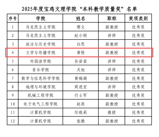 3.2026年1月15日,学校公布了“关于公布2025年‘本科教学质量奖’评选结果的通知”,我院教师黄俏副教授荣获2025年度宝鸡文理学院“本科教学质量奖”优秀奖。