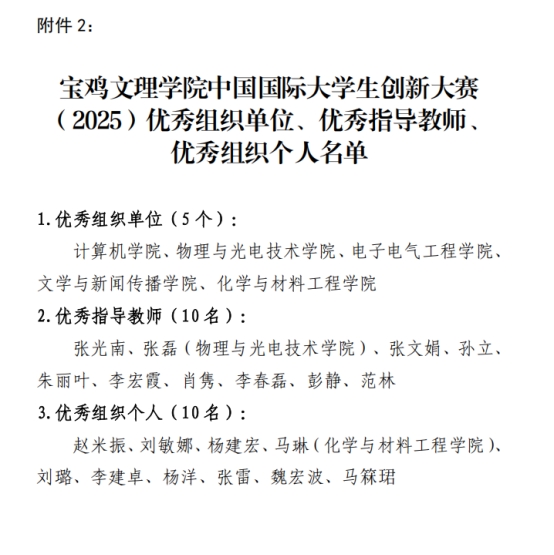 1.2026年1月6日,学校公布了“关于表彰宝鸡文理学院中国国际大学生创新大赛(2025)校赛获奖项目、优秀组织单位、优秀指导教师、优秀组织个人的决定”,我院获优秀组织单位,孙立获优秀指导教师,赵米振获优秀组织个人。