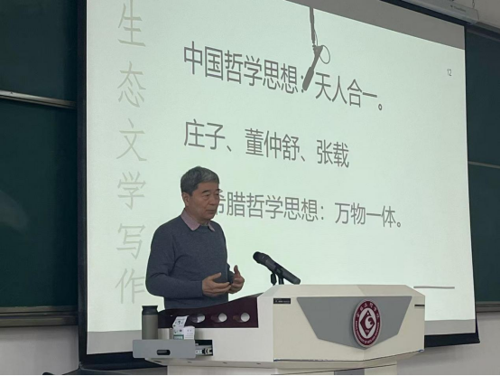 报告中,朱鸿教授以《关于生态文学写作的几个问题》为题,从生态文学的思想基础、缘起、创作选材与形式等方面,系统阐释了创作内涵与路径。他指出,生态文学的核心是秉持生态整体主义、生命共同体理念,摒弃人类中心主义。他梳理了中西生态文学的哲学源流,介绍了中外生态文学发展的标志性作品,强调生态文学写作需深入观察自然万物的互动,以真实感受为创作根基。朱教授结合自己创作的散文《寂寞和凄清的日子近了》,剖析人类活动对生态的影响,传递生态责任。同时,鼓励同学们生态文学的创作形式采用散文体裁,可借助散文具有情感真实丰富的先天优势,深挖作品内涵,而不仅仅是简单描绘风景,浮于表面。在互动环节,同学们围绕生态文学创作与生态发展踊跃提问,朱鸿教授逐一细致解答。
