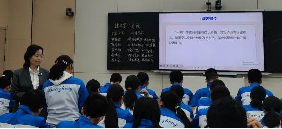 本次见习观摩了宝鸡中学正高级教师、陕西省教学名师曹心桐老师执教的《谏太宗十思疏》一课。课堂上,曹心桐老师以“思”为线索,紧扣文本特征,围绕魏徵劝谏的逻辑结构与语言艺术展开教学。她从“十思”的内涵入手,引导学生梳理文章层次,分析比喻、对比等手法的表达效果,并联系当代现实生活,启发学生思考“居安思危”的时代意义。整堂课条理清晰、张弛有度,既有对文言知识的扎实讲解,又注重学生思维能力的提升与价值观念的引导,充分体现了语文教学的深度与温度。