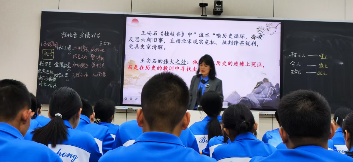 本次见习观摩的是省级教学能手韩敏老师执教的《桂枝香•金陵怀古》公开课。韩敏老师以“登临送目,正故国晚秋”开篇,围绕王安石词作中的历史感怀与景物描摹展开教学。她以“景—情—理”为主线,引导学生从金陵秋景的意象分析入手,逐步深入体会词人“念往昔,繁华竞逐”的深沉喟叹。课堂上,韩老师巧妙运用对比阅读、情境还原、小组合作探究等多种教学策略,充分调动学生的主体意识,鼓励学生在品读中发现问题、在讨论中建构认知。尤其是在对“至今商女,时时犹唱,后庭遗曲”一句的解读中,她引导学生联系历史语境与当代价值,实现了古典诗词与现实关怀的有机融合。
